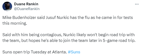 今日努尔基奇因病缺席比赛,布登霍尔泽证实,努尔基奇流感检测呈阳性,由于流感具有传染性,努尔基奇暂时不会随队出征接下来的5连客,可能会在晚些时候加入球队。
