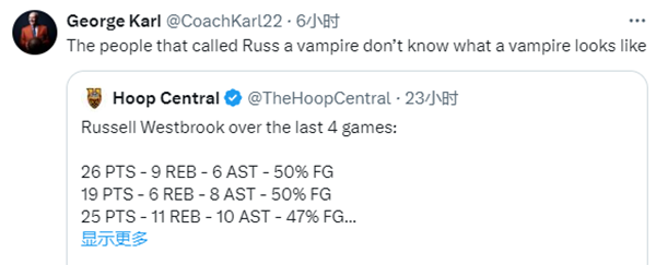 对此,前掘金主帅乔治-卡尔发推评论道:那些称威少是吸血鬼的人不知道吸血鬼是什么样的。
