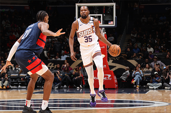 下半场,第三节杜兰特和布克带队35-28单节又赢7分,杜兰特三分不准但招牌中投十分无解,单节7中3连投带罚拿到10分,布克则是单节拿到9分,三节打完太阳领先到21分。