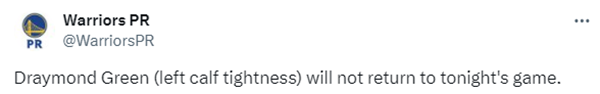 此前因背伤和生病连续缺席了三场比赛,今日追梦复出并且与库里等人一起首发出战,可追梦复出仅打3分钟就受伤了,第一节比赛打到9分钟,施罗德主动犯规,追梦突然下场,坐回替补席并与队医沟通,之后追梦一瘸一拐离场,直接返回更衣室;检查后勇士官方宣布,追梦因左小腿紧张,本场比赛不会回归。