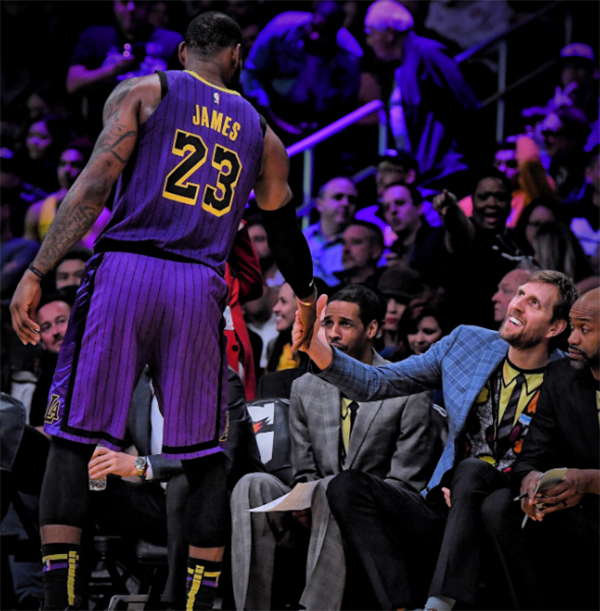 詹姆斯生涯篮板总数达到11489个,追平德克-诺维茨基并列历史篮板榜第26位;只要明天詹姆斯出战黄蜂,预计他就能超越诺维茨基,下一步将追逐尤因(11607个篮板,排在历史第25位),按照老詹本赛季场均7.6个篮板来算,只要再打16场,詹姆斯就能超越尤因。
