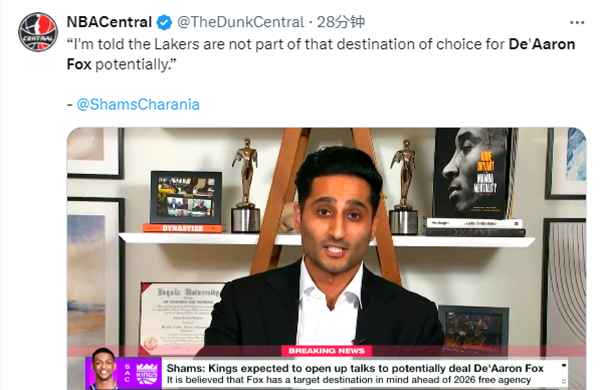 NBA记者Rob Peterson报道,湖人、魔术和热火预计将追逐福克斯,不过shams在节目中报道,湖人并不在福克斯潜在的首选下家名单中,湖人随队记者Dan Woike也透露,福克斯的目的地不是洛杉矶湖人。