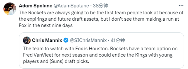 火箭随队记者Adam Spolane更推表示:火箭会因为手中即将到期的合同和未来的选秀资产而成为人们首先关注的球队,但我认为他们在接下来的九天内不会对福克斯发起追求。