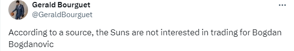 对于太阳追求博格丹的报道,太阳跟队记者Gerald Bourguet表示,消息人士透露,太阳队对博格丹的交易不感兴趣。