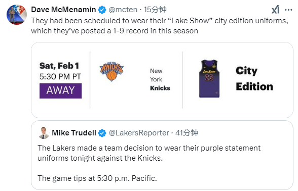 来源:360直播吧02-02 17:29360直播吧讯 北京时间2月2日,NBA常规赛湖人客场大战尼克斯,赛前湖人决定更换球衣,据湖人记者Dave McMenamin和Mike Trudell报道,湖人原计划身穿城市版球衣对阵尼克斯,但赛前湖人决定身穿紫色球衣,不穿“LakeShow”城市版球衣。