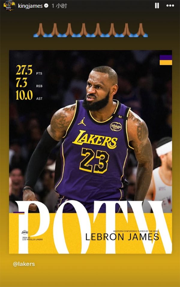 湖人官方晒海报祝贺詹姆斯:这可是40岁,本周西部周最佳——勒布朗-詹姆斯!老詹转发海报并晒表情表达感谢之情。