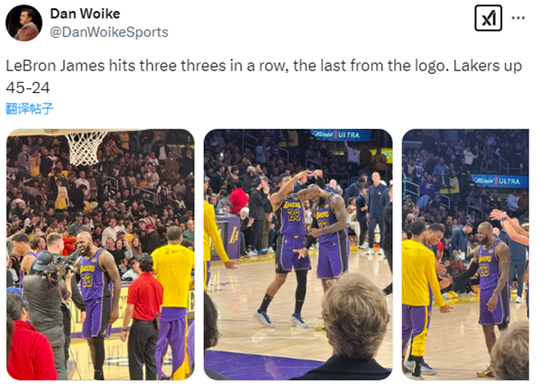 第二节湖人进攻不减,老詹仅仅只用38秒就连中3记三分,踩着logo轰进超远三分点燃球馆,老詹张开双臂激情庆祝,队友为他戴王冠,东契奇乐开怀;面对勇士的反扑,老詹再次杀到禁区暴扣,带队一波攻势领先到26分,可之后湖人集体哑火,库里连得6分缩小分差;不过半场打完,湖人仍69-49领先20分。