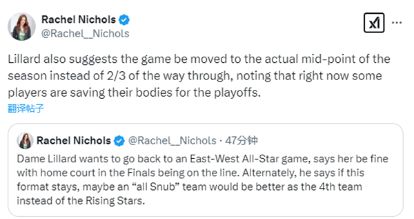 名记Sam Amico发推写道:我试图对全明星周末保持积极的态度,并享受晚上的比赛。我喜欢所有的活力和乐趣。但这种赛制不幸,回到东西部对决。加兰建议给获胜球队的每位球员100万美元,并表示球员们一定会努力比赛。让我们试试看吧。