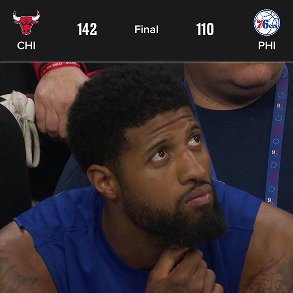 76人主场对阵公牛,恩比德因伤缺席比赛,乔治和马克西带队出战,费城在主场打得十分糟糕——第一节30-39输9分,第二节28-36又输8分;下半场76人第三节18-40狂输22分,三节打完76人已经落后到39分,末节一度落后到50分,虽然之后打出反击高潮,但最终仍遭遇32分惨败。
