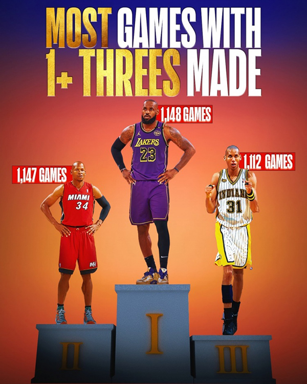 比赛中,詹姆斯末节狂砍16分,全场贡献27分12篮板,率队107-99险胜独行侠。更令人惊叹的是,他以1148场命中至少一记三分的壮举,超越雷・阿伦登顶历史第一。美媒StatMuse的数据堪称“逆生长”奇迹:40岁后的21场比赛,詹姆斯场均轰下26.2分7.8篮板8.4助攻,投篮命中率54%+三分命中率44%,多项核心数据竟反超自己20岁时的表现。