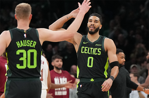 坐镇主场大战联盟第一的骑士,绿军开场不到5分钟就打出25-3的进攻高潮并且早早领先到22分,期间塔图姆、杰伦-布朗、怀特和豪瑟接连轰进7记三分太疯狂;随后骑士反扑缩小分差,塔图姆火力不减继续砍分,第一节打完绿军38-26领先12分,塔图姆首节9投6中独砍18分7篮板3助攻1盖帽。