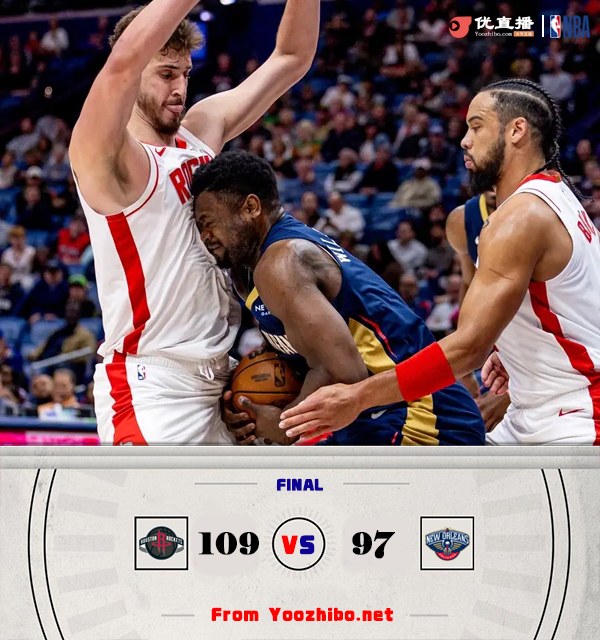 NBA常规赛激战正酣,火箭和鹈鹕两支青年军正面对话,火箭遭遇3连败战绩来到37胜25负,暂列西部第5位,鹈鹕17胜45负排在西部倒数第二。首节开打后墨菲连拿7分率队占优,火箭内外结合及时回应,但墨菲无人可挡单节狂揽15分,鹈鹕领先3分结束首节争夺,次节回来,火箭始终无法打出追分高潮,鹈鹕稳扎稳打保持优势,半场战罢,鹈鹕依然领先3分。易边再战后鹈鹕进攻停滞,申京和杰伦-格林轮番冲击,末段鹈鹕进攻依然毫无起色,火箭顺势拉开比分,三节结束后火箭确立15分优势,末节上来,锡安连造杀伤率队追分,但火箭总能给予回应,最终火箭109-97击败对手,终结3连败的同时也终结客场8连败。