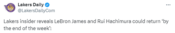 Jovan Buha在撰文描述湖人近况时透露了一组伤情更新,他表示:尽管成果并非总是立竿见影,但湖人还是信任他们新的进攻体系。卢卡-东契奇本身就是一套进攻体系,要在赛季进行到50多场比赛时融入这种级别的天赋球员,这需要时间。一旦詹姆斯和八村垒回归——这可能在本周结束前发生,湖人将处于有利位置,最终实现他们的进攻上限。