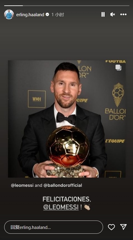 比C罗更大度?哈兰德转发梅西手捧金球帅照!用西语祝贺+鼓掌致敬