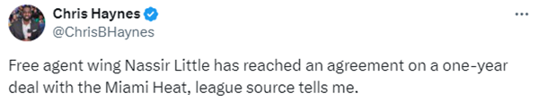 来源:360直播吧09-24 11:25360直播吧讯 北京时间9月24日,据名记Chris Haynes的报道,热火已经与自由球员前锋纳西尔-利特尔达成了一份一年合同,成为热火队大名单第15名球员。