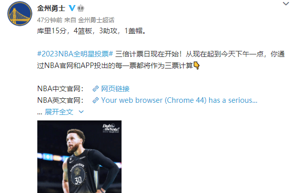 比赛结束之后,勇士官方以“刷屏”一般的姿态连续在社交媒体上给自家的球员们拉票,因为今天是特殊的日子,是NBA全明星的三倍计票日,也就是说今天投票的话,一票等于三票,所以这样的几乎是一定要把握住的。