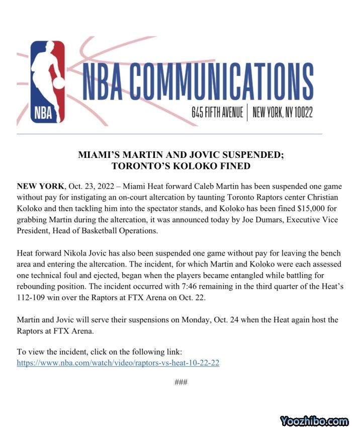 NBA官方声明,马丁因抱摔对手引冲突被禁赛一场,热火新秀约维奇因离开替补席被禁赛一场,科洛克因在争吵时抓了马丁被罚款1.5万美元。