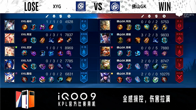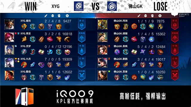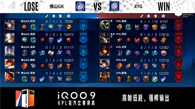 双方常规开局。2分33秒中路团战XYG打出0换2。4分45秒XYG拿下暴君。5分44秒发育路团战佛山GK打出1换3,娜可露露拿到三连决胜。7分29秒佛山GK摧毁敌方对抗路外塔。8分52秒佛山GK拿下主宰。9分14秒中路团战佛山GK打出0换2。11分04秒主宰处团战XYG打出0换2并摧毁敌方中路外塔。13分19秒XYG拿下暗影主宰。14分10秒XYG摧毁敌方对抗路二塔。16分07秒XYG摧毁敌方中路二塔。18分01秒XYG拿下暗影主宰。19分32秒XYG摧毁敌方发育路高地塔。19分45秒发育路团战双方2换2。21分42秒中路团战佛山GK打出2换3,不知火舞拿到三连决胜。22分30秒XYG镜对抗路单杀不知火舞。23分03秒XYG拿下风暴龙王。24分15秒XYG野区击杀不知火舞。24分40秒高地团战XYG打出0换2。24分50秒XYG摧毁敌方水晶拿下比赛。