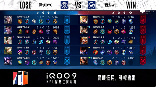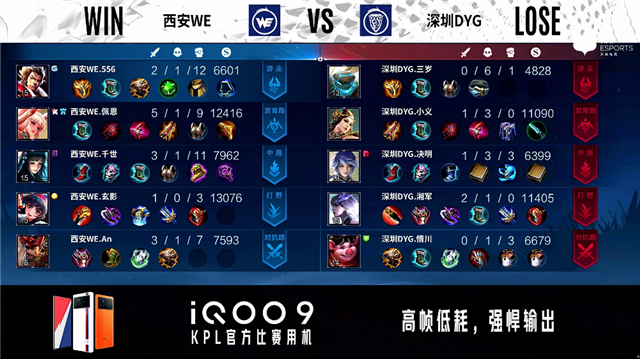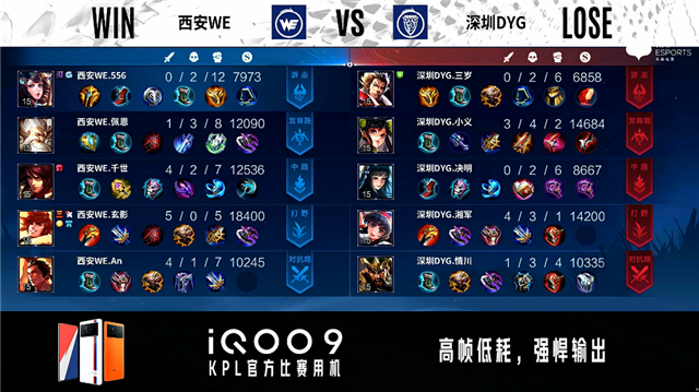 2分32秒,西安WE公孙离击杀盾山拿下一血。3分42秒,深圳DYG控下先知主宰,随后西安WE控下暴君。4分38秒,下路团,西安WE打出0换2,西施拿下双杀。5分07秒,西安WE破掉深圳DYG下一塔。6分35秒,野区团,深圳DYG打出2换3。分钟,深圳DYG控下先知主宰,随后西安WE控下暴君。8分33秒,西安WE破掉深圳DYG下二塔。8分46秒,西安WE击杀盾山。10分22秒,西安WE控下暗影暴君,随后深圳DYG控下暗影主宰,西安WE团战打出0换2。10分40秒,西安WE破掉深圳DYG中一塔。12分钟,西安WE击杀弈星并破掉西安WE上二塔。14分07秒,西安WE控下暗影主宰,随后再控下暗影暴君。15分10秒,西安WE破掉深圳DYG下高地,随后团战西安WE打出1换4。15分28秒,西安WE一波摧毁深圳DYG水晶赢下比赛。