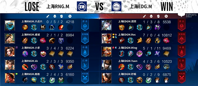 2分20秒娜可露露拿下暴君。3分钟上路团战,成吉思汗拿下一血,双方2换2。4分40秒双方互换边路一塔。5分钟娜可露露拿下主宰。6分钟嬴政推掉上路一塔。7分钟镜拿下暴君。8分30秒周瑜推掉上路二塔。9分钟嬴政推掉中路一塔。9分30秒野区团战,上海EDG.M打出1换2。10分钟娜可露露被单杀,马可波罗推掉中路一塔。10分31秒镜拿下主宰。12分20秒中路团战,上海EDG.M打出1换2。13分20秒镜拿下暴君。14分20秒中路团战,双方1换1。15分16秒成吉思汗拿下主宰。16分钟上路团战,上海RNG.M打出2换3。17分钟马可波罗拿下暴君。18分钟野区团战,上海EDG.M团灭上海RNG.M。19分02秒上海EDG.M推掉水晶拿下本场比赛胜利。