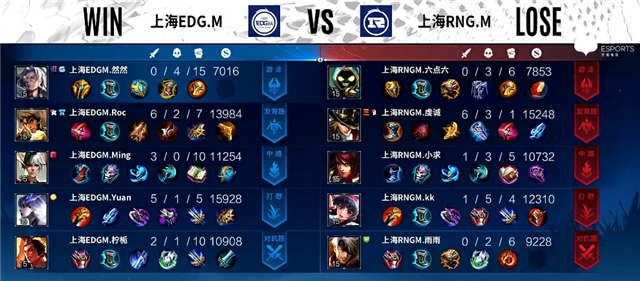 2分16秒赵云拿下暴君。3分20秒鲁班七号拿下一血。3分50秒赵云拿下主宰。4分钟上路团战,上海RNG.M打出1换3。5分钟赵云推掉下路一塔。5分30秒中路团战,上海EDG.M打出1换3。6分50秒鲁班七号推掉上路一塔。7分钟上路团战,双方2换2。9分30秒赵云拿下主宰。10分10秒赵云推掉中路二塔。10分20秒下路团战,上海EDG.M打出1换2。10分30秒上海EDG.M推掉中下高地塔,团战双方1换1。11分40秒赵云拿下主宰。12分25秒上路团战,上海EDG.M团灭上海RNG.M。12分41秒上海EDG.M推掉水晶率先拿下一分。