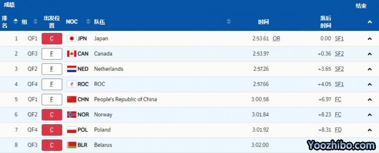 24直播网2月12日讯 冬奥会速度滑冰女子团体追逐1/4决赛,中国排名第五无缘晋级半决赛,成绩为3分00秒58。日本2分53秒61排名第一打破奥运纪录,另外三支晋级的队伍是加拿大、荷兰和俄奥队。1/4决赛中成绩最好的4支队伍进入半决赛,第5名和第6名的队伍进入C组决赛,其他两只队伍进入D组决赛。