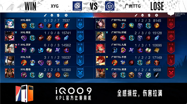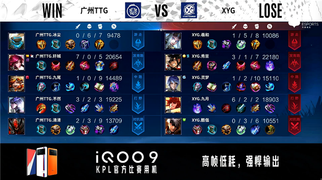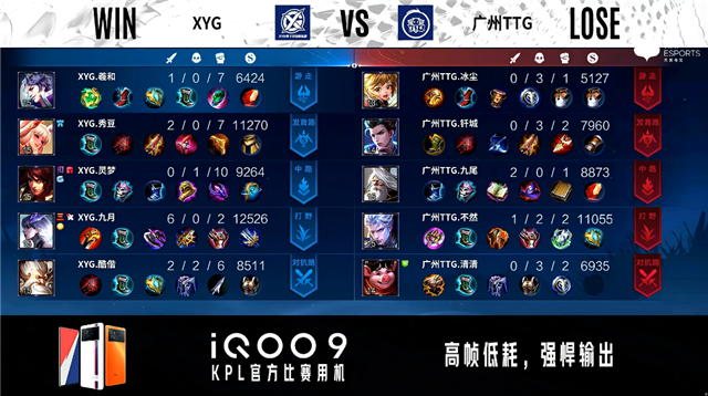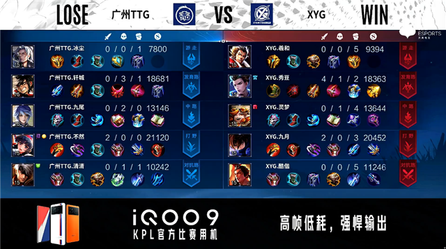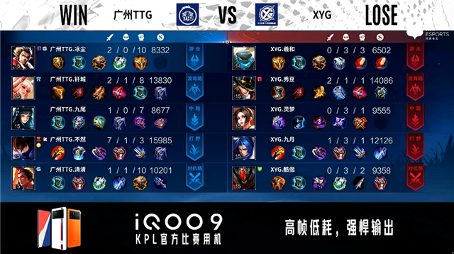 双方常规开局。1分16秒XYG拿到中路河道之灵。3分18秒XYG拿下暴君。3分46秒广州TTG拿下主宰。5分40秒XYG摧毁敌方发育路外塔。6分22秒广州TTG摧毁敌方对抗路外塔。7分26秒对抗路团战双方1换1。8分11秒XYG拿下暴君。10分19秒广州TTG拿下暗影暴君。13分22秒XYG摧毁敌方中路外塔。13分37秒XYG拿下暗影主宰。14分44秒中路团战广州TTG击杀狄仁杰。15分01秒广州TTG拿下暗影暴君。18分43秒XYG拿下暗影主宰,广州TTG拿下暗影暴君。20分02秒XYG摧毁敌方对抗路二塔。20分21秒中路团战XYG击杀弈星。21分15秒XYG野区击杀蒙犽。21分20秒XYG摧毁敌方中路二塔。22分01秒XYG拿下风暴龙王。22分53秒XYG摧毁敌方对抗路高地塔。23分44秒XYG摧毁敌方发育路高地塔。25分56秒野区团战XYG打出0换2。26分44秒XYG摧毁敌方水晶拿下比赛。