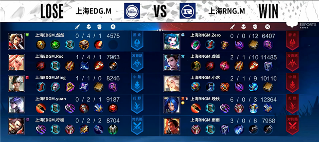 2分钟上路交火,马超拿下一血。4分钟夏侯惇被击杀。4分27秒上海EDG.M下路一塔被破。4分40秒阿古朵拿下主宰,赵云拿下暴君。5分钟上路团战,鲁班大师被击杀。7分55秒阿古朵推掉中路一塔。8分钟阿古朵拿下暴君。10分50秒阿古朵拿下主宰。11分35秒虞姬推掉上路二塔。11分45秒中路团战,上海RNG.M打出1换2。12分钟上海EDG.M推掉上路高地塔。13分30秒赵云拿下暴君。14分55秒鲁班七号推掉中路一塔。15分钟主宰团,上海EDG.M打出0换2,赵云拿下主宰。16分钟下路团战,上海RNG.M打出2换3。17分钟赵云拿下暴君。18分50秒鲁班七号推掉中路高地塔。20分钟中路团战,双方3换3。22分钟中路团战,马超拿下三杀,上海EDG.M团灭上海RNG.M。23分钟上海EDG.M推掉水晶率先拿下一分。