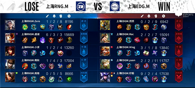 1分钟河道团战,不知火舞拿下一血,上海RNG.M打出0换3。2分钟吕布被击杀。3分钟上海RNG.M入侵野区,上海EDG.M打出0换2。3分40秒盘古拿下暴君。5分21秒成吉思汗推掉下路一塔。5分钟下路团战,上海RNG.M打出0换4。5分20秒盘古拿下主宰。7分30秒上海RNG.M入侵野区,团战打出0换2。8分钟中路团战,上海RNG.M打出1换4。9分钟澜拿下暴君。10分钟成吉思汗推掉中路二塔。10分22秒澜拿下主宰。11分10秒成吉思汗推掉中路高地塔。13分钟上路团战,上海EDG.M打出1换3。14分钟盘古拿下主宰。15分钟下路团战,上海RNG.M打出1换2。15分40秒高地团战,上海RNG.M团灭上海EDG.M并推掉水晶追平比分。