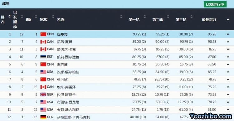 李方慧:第一跳期间做了一个900,拿到81.75分,暂列第五。第二跳期间做了个900,并以1080结尾,拿到86.50分,排在第五!第三跳在第五个动作落地失误,仅拿到16.75分,个人最佳成绩定格在86.50分,确定无缘奖牌!