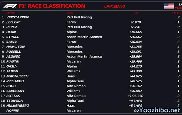 第四到第十名依次为:奥康、斯托尔、塞恩斯、汉密尔顿、拉塞尔、阿隆索、皮亚斯特里。中国车手周冠宇第15名完赛。