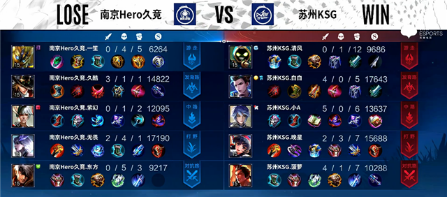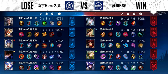 2分钟上路团战,澜拿下一血。2分33秒不知火舞被击杀。3分20秒暃拿下暴君。3分47秒双方互换边路一塔。4分27秒澜拿下主宰。5分10秒下路团战,南京Hero久竞打出0换2。7分钟澜拿下暴君。8分钟暃拿下主宰,团战双方1换1。9分钟虞姬被击杀。10分42秒中路团战,苏州KSG打出0换2。11分钟澜拿下暴君。11分10秒公孙离推掉中路一塔,廉颇被击杀。11分50秒暃拿下主宰。13分钟双方互换边路二塔。16分30秒暃拿下主宰。17分20秒暃拿下暴君。17分50秒中路团战,暃被击杀,南京Hero久竞推掉中路一塔。19分钟鬼谷子被击杀。19分31秒高地团战,苏州KSG打出1换2。20分26秒澜拿下风暴龙王,鬼谷子被击杀。22分20秒上路团战,暃被击杀。22分50秒高地团,双方2换2,苏州KSG推掉上路高地塔。25分钟风暴龙王团,澜拿下风暴龙王,苏州KSG团灭南京Hero久竞。26分11秒苏州KSG推掉水晶拿下本场比赛胜利。