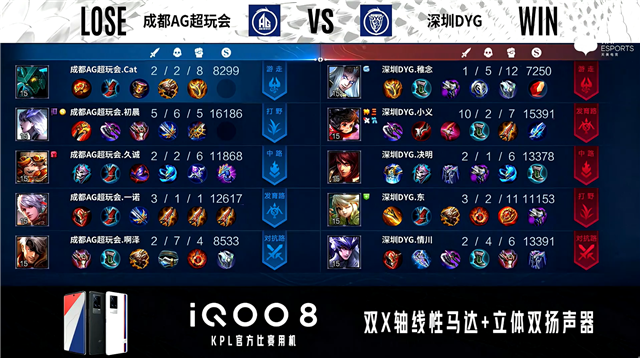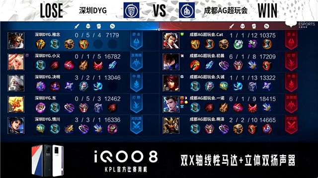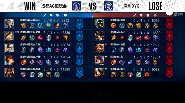双方常规开局。2分19秒深圳DYG拿下暴君。3分43秒成都AG中路击杀云缨拿到一血。4分05秒成都AG发育路击杀鲁班七号。5分27秒成都AG发育路击杀嬴政。6分30秒成都AG拿下暴君,团战成都AG打出2换4。7分03秒成都AG摧毁敌方中路外塔。10分08秒成都AG摧毁敌方发育路二塔。20分29秒成都AG拿下暗影暴君。10分42秒成都AG摧毁敌方对抗路二塔。11分53秒成都AG拿下暗影主宰。14分37秒成都AG拿下暗影暴君。16分08秒成都AG拿下暗影主宰。17分56秒成都AG发育路击杀蒙恬并摧毁敌方发育路高地塔。18分48秒成都AG拿下暗影暴君。20分56秒龙王处团战成都AG打出1换4。21分28秒成都AG摧毁敌方水晶拿下比赛。