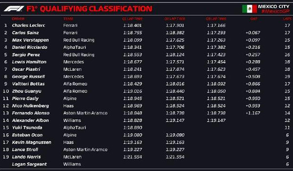 360直播吧讯 北京时间10月29日,2023年F1墨西哥城大奖赛排位赛结束,勒克莱尔获得杆位,这也是他职业生涯的第22个杆位;他的队友塞恩斯第二,法拉利车队包揽了正式比赛头排发车位。红牛车队的维斯塔潘排名第三,小红牛车队里卡多第四,主场作战的佩雷兹第五。汉密尔顿、皮亚斯特里、拉塞尔、博塔斯以及中国车手周冠宇分列六至十位。