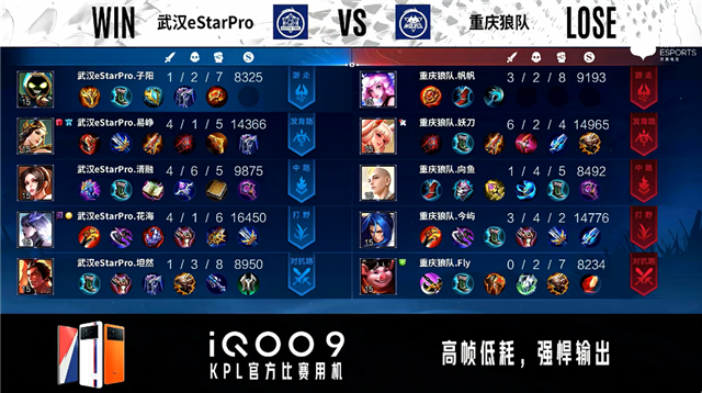开局武汉eStar对抗路、中路换线。2分59秒武汉eStar拿下暴君并击杀橘右京拿到一血。3分34秒发育路双方2换2。4分09秒武汉eStar中路击杀金蝉。4分25秒野区团战重庆狼队打出1换2。4分48秒武汉eStar摧毁敌方发育路外塔。5分01秒重庆狼队中路击杀吕布。6分06秒武汉eStar中路击杀瑶。10分46秒重庆狼队拿下暗影暴君,武汉eStar拿下暗影主宰。11分07秒重庆狼队中路击杀不知火舞。11分46秒重庆狼队摧毁敌方中路外塔。13分08秒重庆狼队主宰处击杀不知火舞。13分25秒重庆狼队摧毁敌方中路二塔。14分33秒重庆狼队拿下暗影暴君,团战双方2换2。15分32秒武汉eStar摧毁中路外塔。15分41秒武汉eStar拿下暗影主宰,团战重庆狼队打出0换2。18分35秒武汉eStar拿下暗影暴君。19分10秒对抗路团战武汉eStar打出2换4。19分46秒武汉eStar团灭对手摧毁水晶拿下比赛。