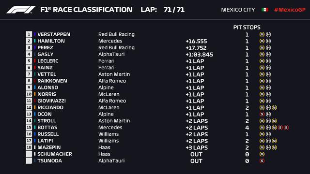 维斯塔潘冲线夺冠!至此比赛结束,佩雷兹最终没能完成超越,汉密尔顿第二,佩雷兹第三,加斯利第四,勒克莱尔第五。第六至第十的车手分别是塞恩斯、维特尔、莱科宁、阿隆索以及诺里斯。