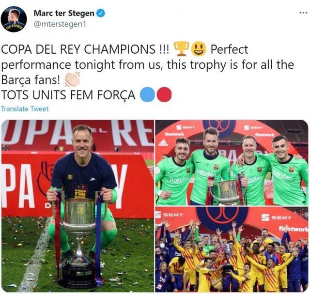 24直播网讯 北京时间今天凌晨,国王杯决赛,巴萨4-0大胜毕尔巴鄂竞技,夺得了国王杯冠军,赛后特尔施特根在推特上发文庆祝。