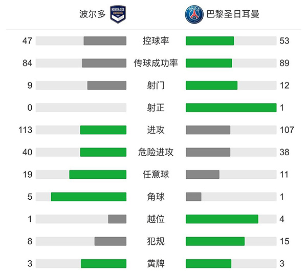 最终全场比赛结束,巴黎圣日耳曼客场1-0小胜波尔多。