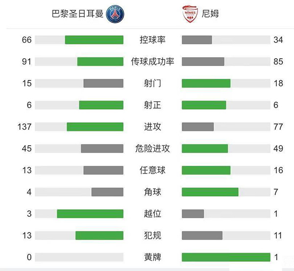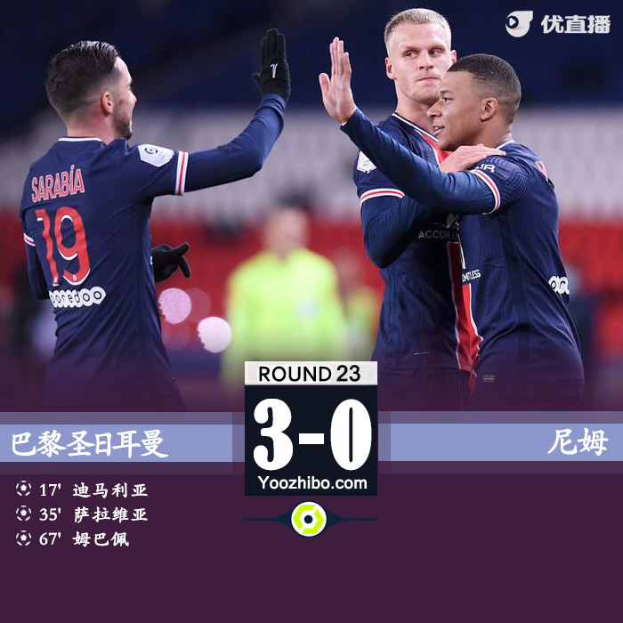随后全场比赛结束,巴黎圣日耳曼3-0尼姆暂时升至积分榜第二。