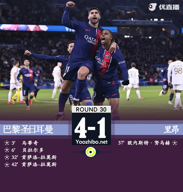 全场比赛结束,巴黎4-1轻取里昂。