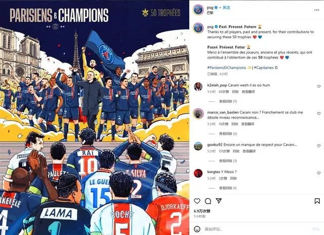 巴黎官方写道:“过去、现在、未来。感谢过去、现在的所有球员为获得这50个奖杯所做的贡献。”