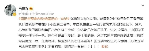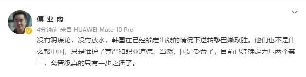 《足球周刊》杂志总编辑傅亚雨表示:“没有阴谋论,没有放水,韩国在已经锁定出线的情况下逆转黎巴嫩取胜。他们也不是什么帮中国,只是维护了尊严和职业道德。当然,国足受益了,目前已经确定力压两个第二,离晋级真的只有一步之遥了。”