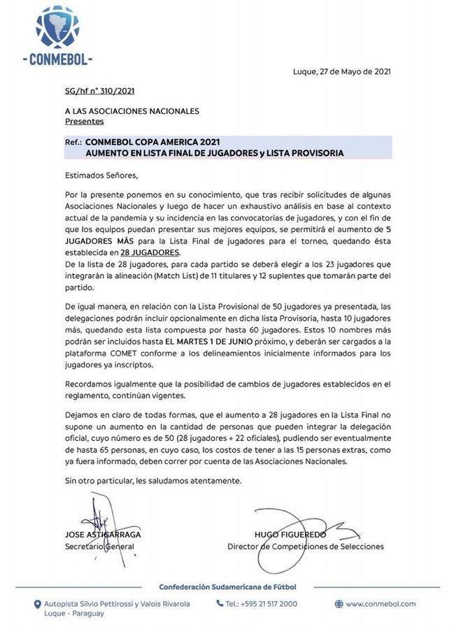 官方: 美洲杯大名单增加至28人, 每场仍只报23