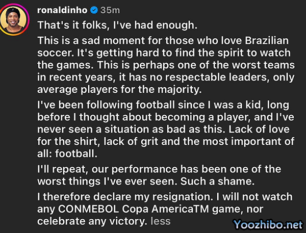 有记者表示小罗的言论是阐述球迷们的观点,引发争议之后,小罗重申,对于那些热爱巴西足球的人来说,这是一个悲伤的时刻,现在很难找到看比赛的精神了,这是近年来最差的球队之一,没有令人尊敬的领导者,大多数球员都是平庸的球员。
