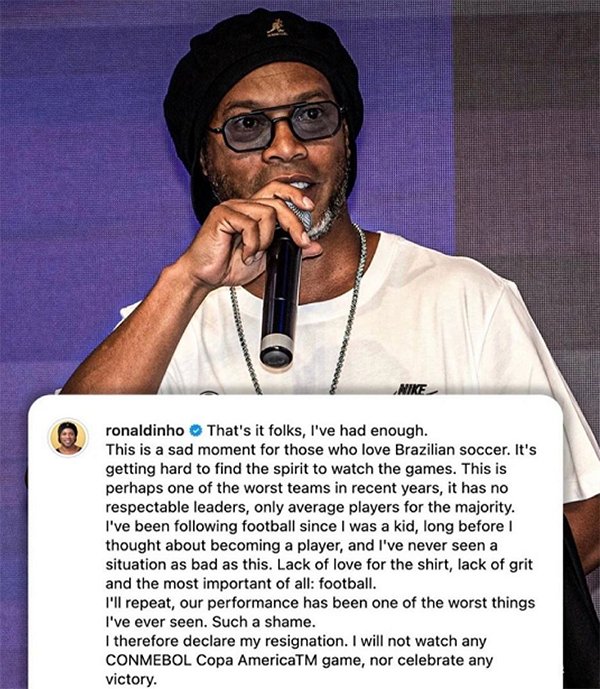 事情的起因是小罗在社交媒体上谈到对于巴西队参加美洲杯的期待,批评称没有勇气,没有奉献精神,缺乏决心,缺乏欢乐。踢得也糟糕,自己不会看任何一场巴西队的比赛。