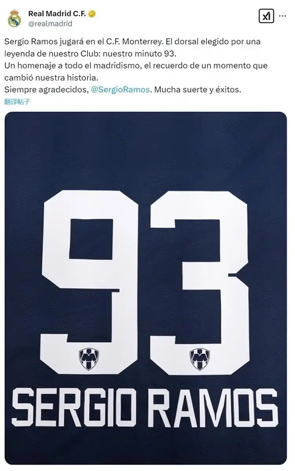 拉莫斯谈选择93号球衣的原因:“第93分钟是史诗级的,这是对皇马和我职业生涯的致敬。”