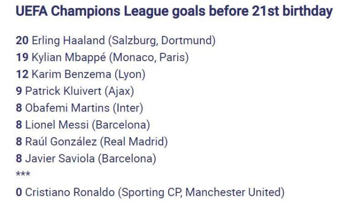 在欧冠21岁以下射手榜上,哈兰德以20球高居榜首,姆巴佩19岁紧随其后,而梅西在这个年龄段时只有8粒欧冠进球,C罗则是1粒都没有。