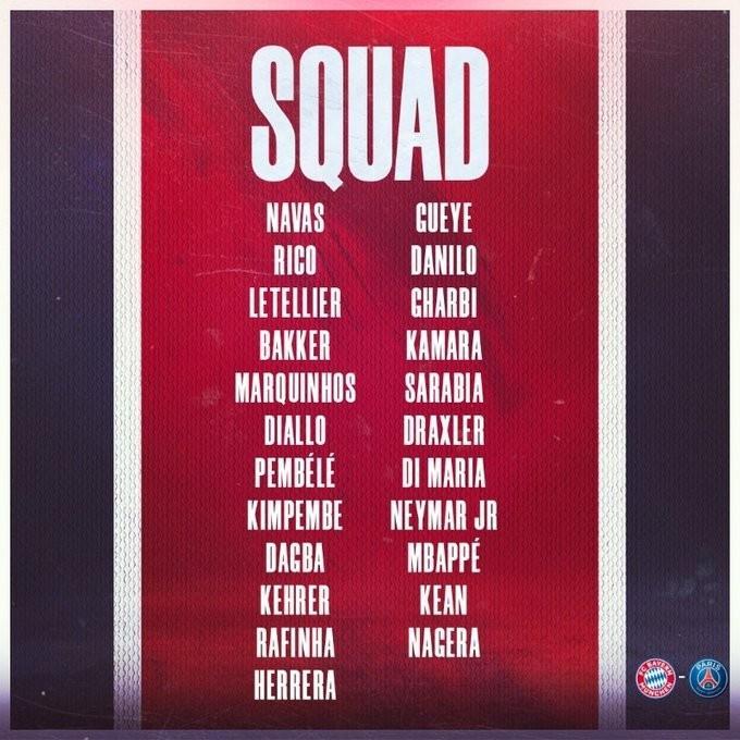 赛前巴黎公布了本场比赛球队的大名单。内马尔、姆巴佩领衔,纳瓦斯在列,维拉蒂和弗洛伦齐因感染新冠缺席。