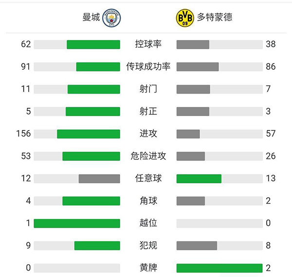 全场比赛结束,首回合曼城主场2-1战胜多特。