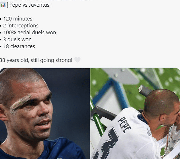 今年已经38岁的佩佩今天贡献了全场最多的18次解围、高空球争顶成功率100%和12次头球解围,这三项数据都是全场最高的。除了数据层面之外,佩佩在防守端的贡献还体现在拼劲和斗志上,关键防守让对手踢丢空门,出色的跑位让尤文图斯球员争不到头球的良机。这一系列的表现都让佩佩成为了本场比赛波尔图爆冷的最大功臣,当之无愧。